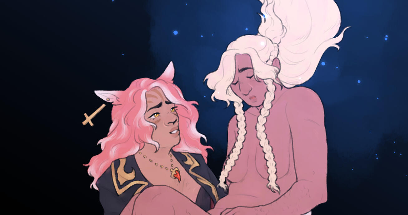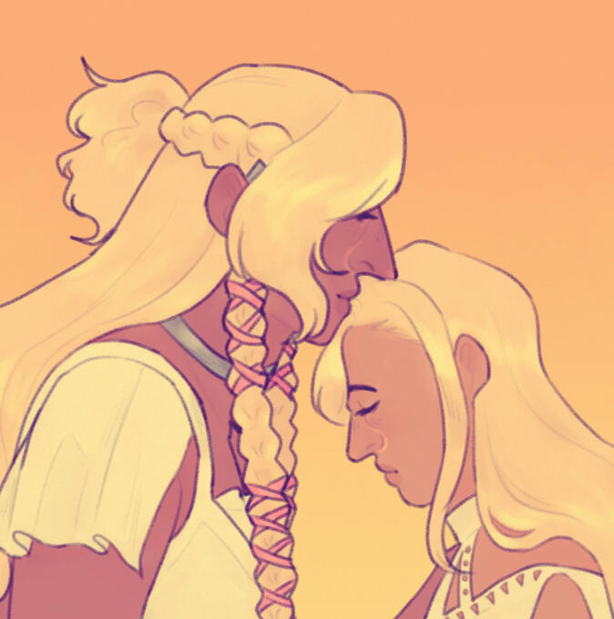 Two pillars leaning on each other at world's end. Minfilia and A'vaya are each other's strength in the hardest of times, always able to rely on each other. It's difficult to summarize their relationship and dynamic, fraught with complicated situations and feelings— such is life when you're the savior of worlds. A scorching and harsh sun, accompanied by the moon who reflects her light, softer, more forgiving. Never seen at the same time, but they share the same sky.